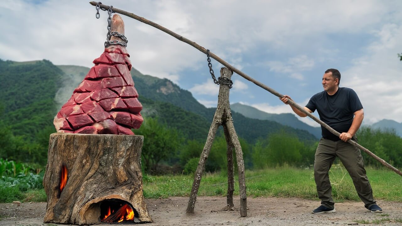 Primitive cooking a whole beef leg inside a hollow log over open fire — a traditional outdoor recipe that uses firewood, wild herbs, and plums to create deep flavor. Watch the full process: from harvesting ingredients to slow-cooking the meat in a burning tree trunk and serving it to family in a mountain village. A unique blend of ancient techniques and countryside life.